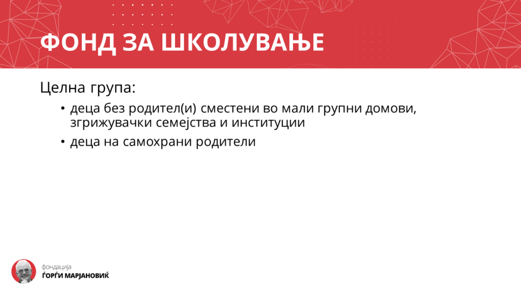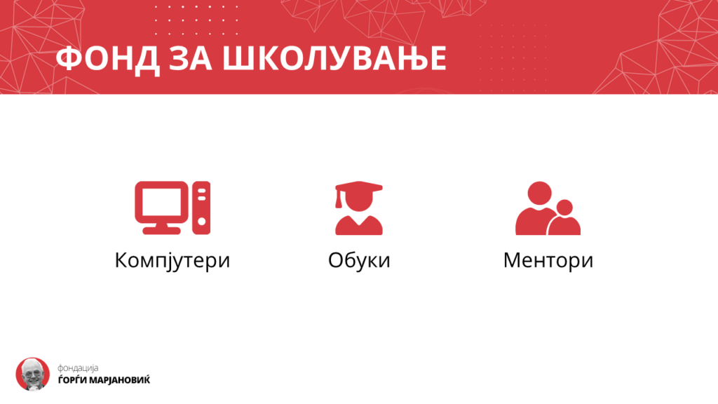 Сега имам чест да ви претставам еден од нашите најважни проекти кој го нарековме фонд за школување.