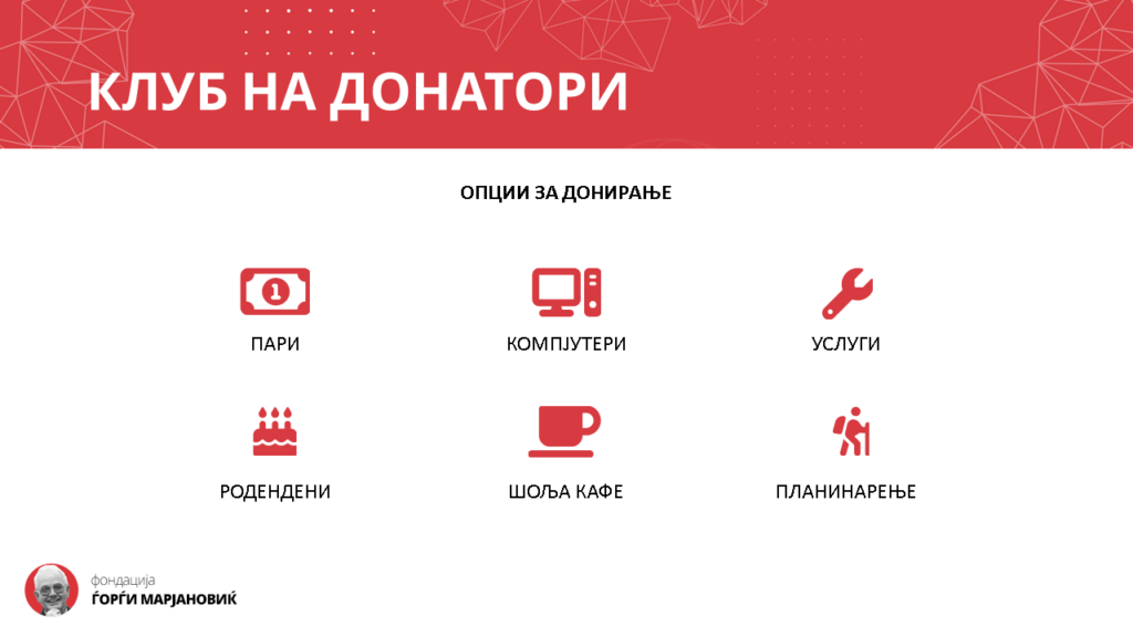 За да успееме да го реализираме ова, неопходна ни е помош од вас, односно од вашите компании. За таа цел го формираме и клубот на донатори во кој компаниите имаат можност да станат членови со бирање на најмалку 2 од понудени 6 опции за донирање, од кои 3 ги вклучуваат и нивните вработени: