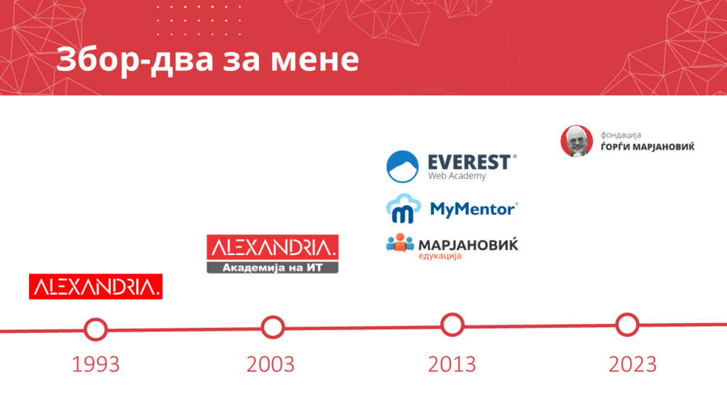 За себе само ќе кажам дека цел живот се занимавам со едукација. Ја основав Александрија, првата школа за компјутери пред 30 години, потоа Академијата на ИТ Александрија пред 20 години, а со учење на далечина се занимавам во последниве 10. За сето тоа време јас и мојот тим им помагавме на илјадници луѓе да ги остварат своите кариерни цели.