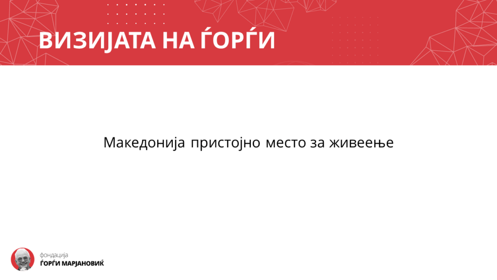 Денес доаѓам во својство на извршен директор на Фондацијата Ѓорѓи Марјановиќ и ќе ви го претставам планот како замислуваме Македонија да ја направиме пристојно место за живеење барем за некого.