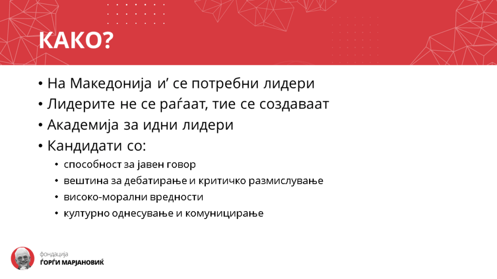 Со оглед на тоа што луѓето не се раѓаат како лидери туку стануваат преку долг низ на настани, ја формиравме Академијата за идни лидери која е целосно бесплатна, наменета за деца и млади и има за цел да им помогне ги обликуваат во луѓе кои ќе ја стекнат почитта на јавноста благодарение на сетот знаења, вештини, морални вредности и однесување кон луѓето.