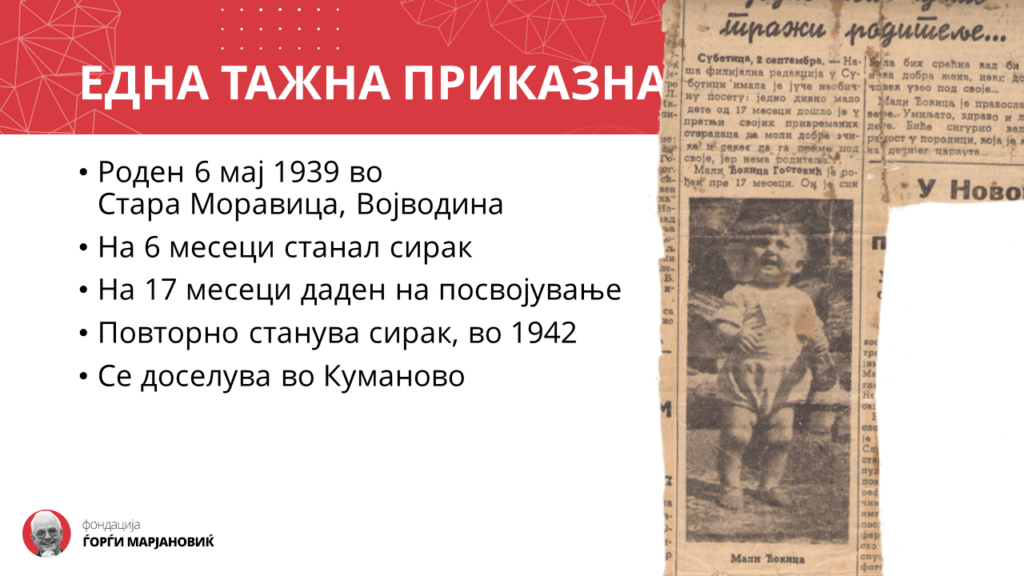 Мојот татко имал само 6 месеци кога останал без татко. Тој бил крвнички убиен, а неговата сопруга, мојата баба, поради тоа доживеала нервен слом и морала да биде хоспитализирана. Тој подоцна бил даден на посвојување но повторно немал среќа затоа што набрзо, во 1942 и неговиот посвоител, Часлав Марјановиќ бил убиен од четниците. Подоцна, жената која го посвоила го носи во Куманово каде што Ѓорѓи започнува помирниот дел од својот живот.